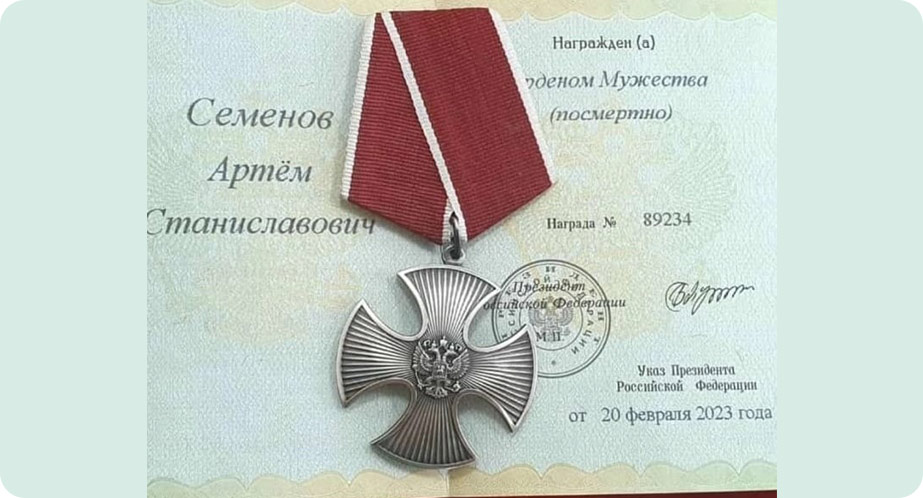 На фото: Данил Саитов награжден государственной наградой «Орден Мужества» (посмертно) (ноябрь, 2022 года)
