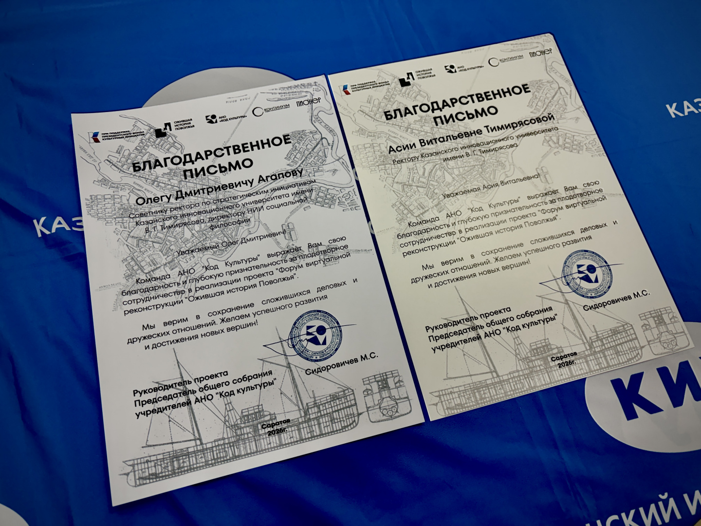 По завершении форума представители АНО «Код культуры» вручили благодарственные письма за плодотворное сотрудничество в реализации проекта «Форум виртуальной реконструкции «Ожившая история Поволжья» ректору КИУ имени В.Г. Тимирясова Тимирясовой Асии Витальевне и Агапову Олегу Дмитриевичу.