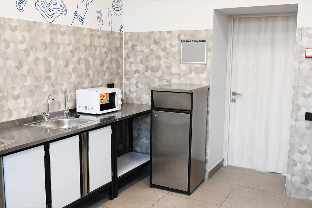 На этаже: кухня (микроволновки, электрические плиты, электрочайник), гладильная комната (гладильная доска, утюг, сушилка, стиральные машины).
