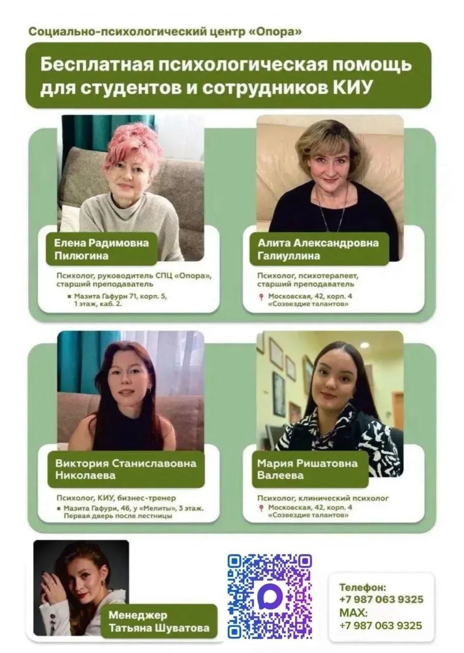Для студентов вуза и колледжа КИУ работает социально-психологический центр «Опора», в котором можно получить бесплатные психологические консультации по следующим проблемам: